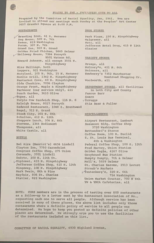 The page lists “places to eat-facilities open to all”—restaurants, coffee shops, snack bars, and cafeterias in St. Louis city and county where African Americans would not be refused service. CORE created this list by surveying locations that maintained a policy of admitting people regardless of skin color and then confirming the policy through “test” visits to the locations by (both black and white) volunteers.