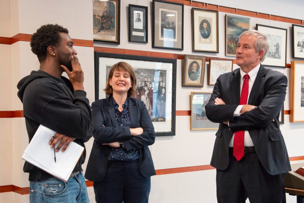 Charlotte Montel (center) and Laurent Bili (right) speak with students and staff.