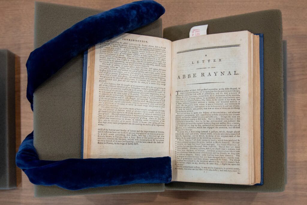 Among other exhibited books and materials were the Declaration of the Rights of Man and Citizen, 1790; Condorcet’s Esquisse d’un tableau historique des progrès de l’esprit humain, 1798; Rousseau’s A Dissertation on Political Economy, 1797; and several eighteenth-century pamphlets authored by French revolutionaries. The exhibit was curated by Cassie Brand, curator of rare books; Lino Mioni, Romance languages librarian; and Ben Wexler, a graduate student in history.
