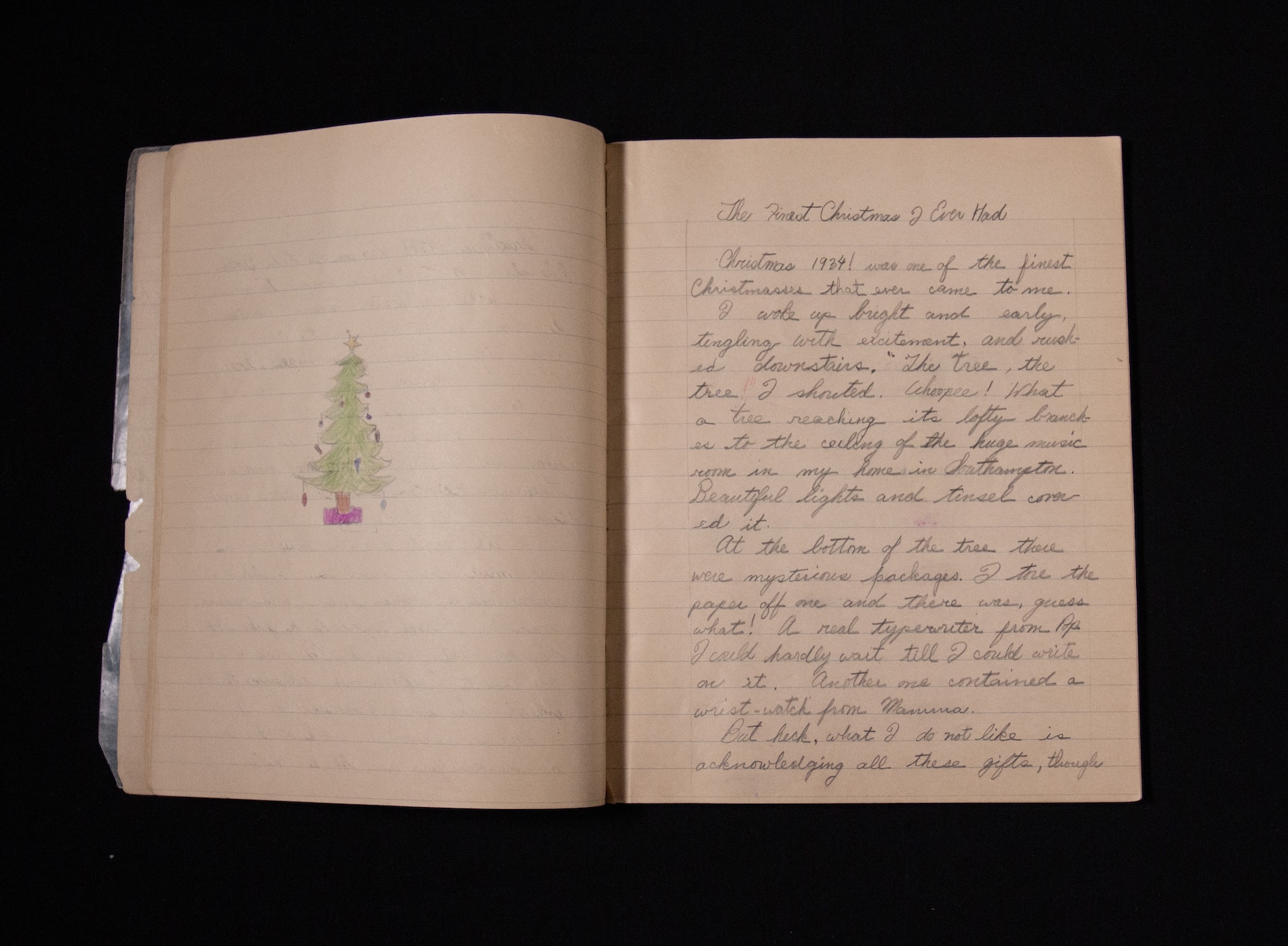 In this journal for English class in 1935-36, Merrill describes Christmas morning in 1934 in the music room of The Orchard, and his excitement about receiving “a real typewriter” from his father.
