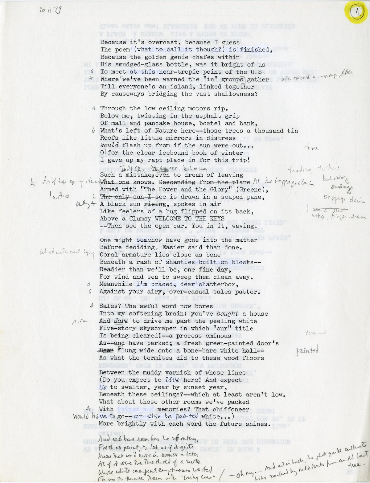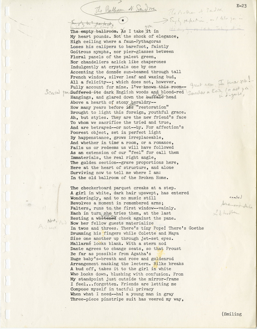 Merrill would jot down the conversations during the seances, then type them up before incorporating the transcriptions into his poems. In this entry, Unice, who guards the doorway into the Sandover ballroom, is speaking to them (in English and French) about creation.