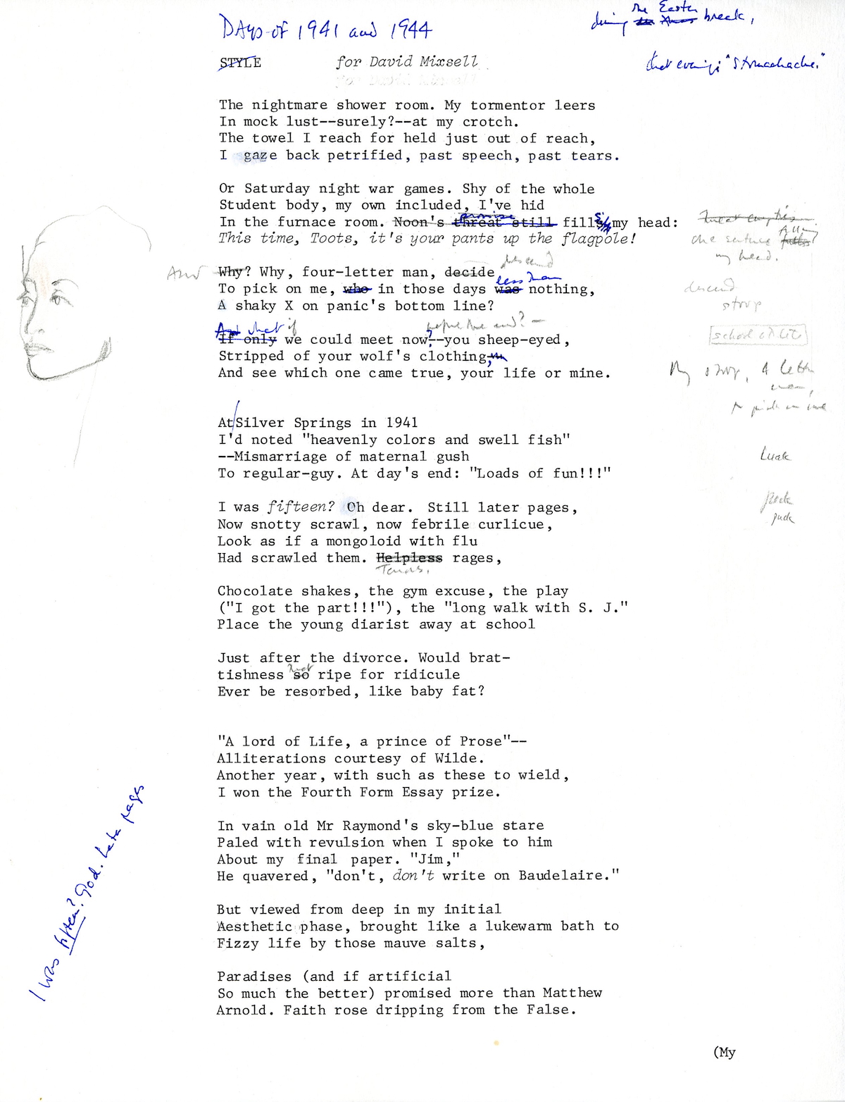 Published in Late Settings (1985), “Days of 1941 and ’44” recalls Lawrenceville School and Merrill using his diaries to become a “poet of memory.” The poem is dedicated to David Mixsell, his arch-nemesis at Lawrenceville, who would die in Europe on D-Day.
