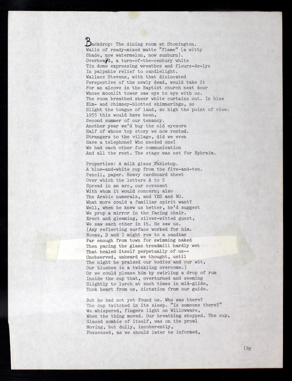 The imaginary manor called Sandover was the setting for the concluding parts of Merrill’s Ouija board epic, Scripts for the Pageant and “Coda: The Higher Keys.” The name had an amalgamation of meanings and was inspired by a real place in his life, The Orchard in Southampton. In general, Merrill and Jackson visited the fantastical realm of the Ouija board together for almost forty years, via séances most often at their dining room table in Stonington or Athens.