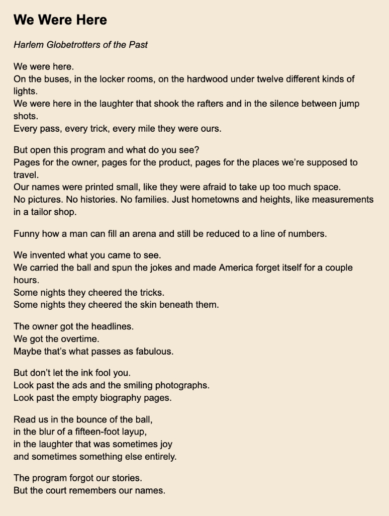 Poem by Zander Ealy, from Reimagining the Harlem Globetrotters.