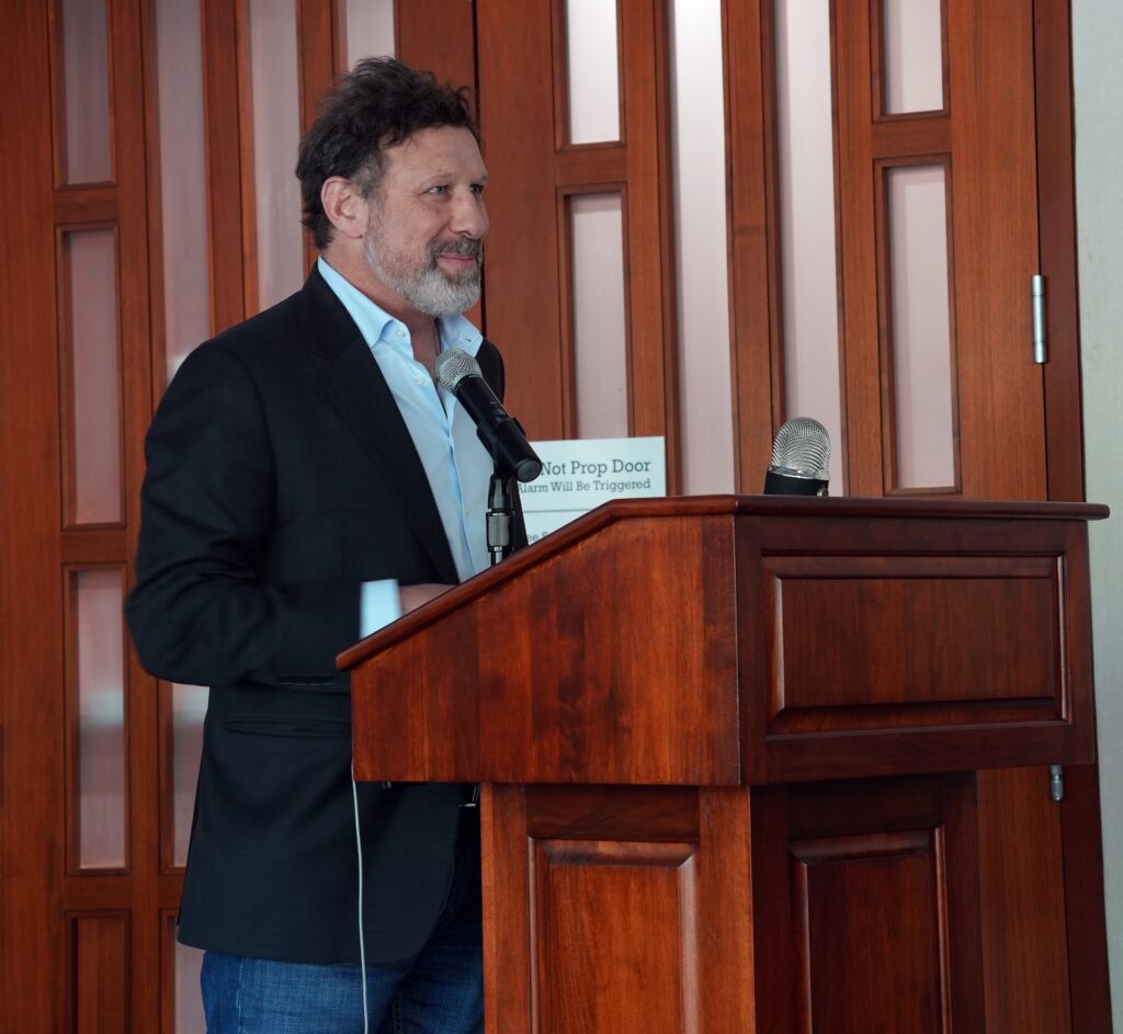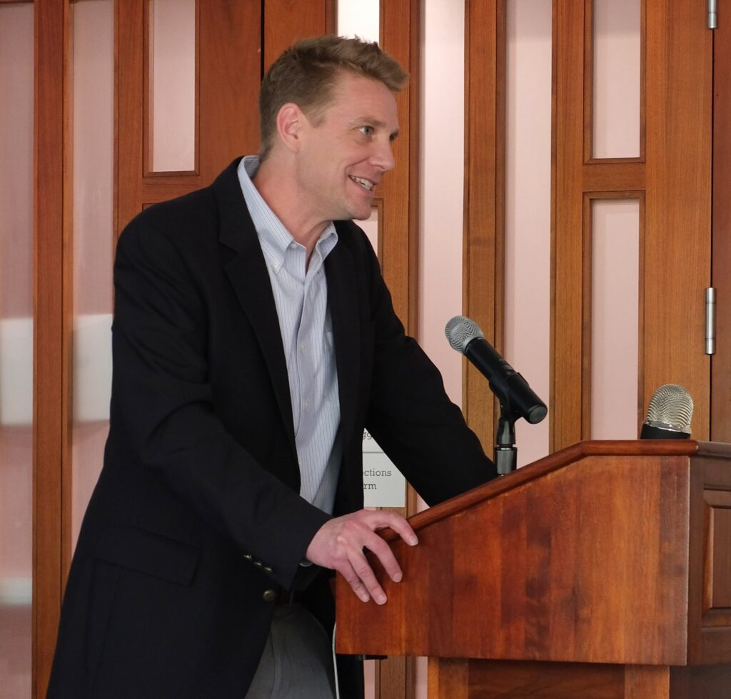 Stanley Elkin Professor in the Humanities and English Department Chair Abram Van Engen spoke next. He talked about the privilege of holding the endowed Elkin chair and read an amusing passage from Elkin’s 1979 triptych, The Living End. He then introduced the three speakers.