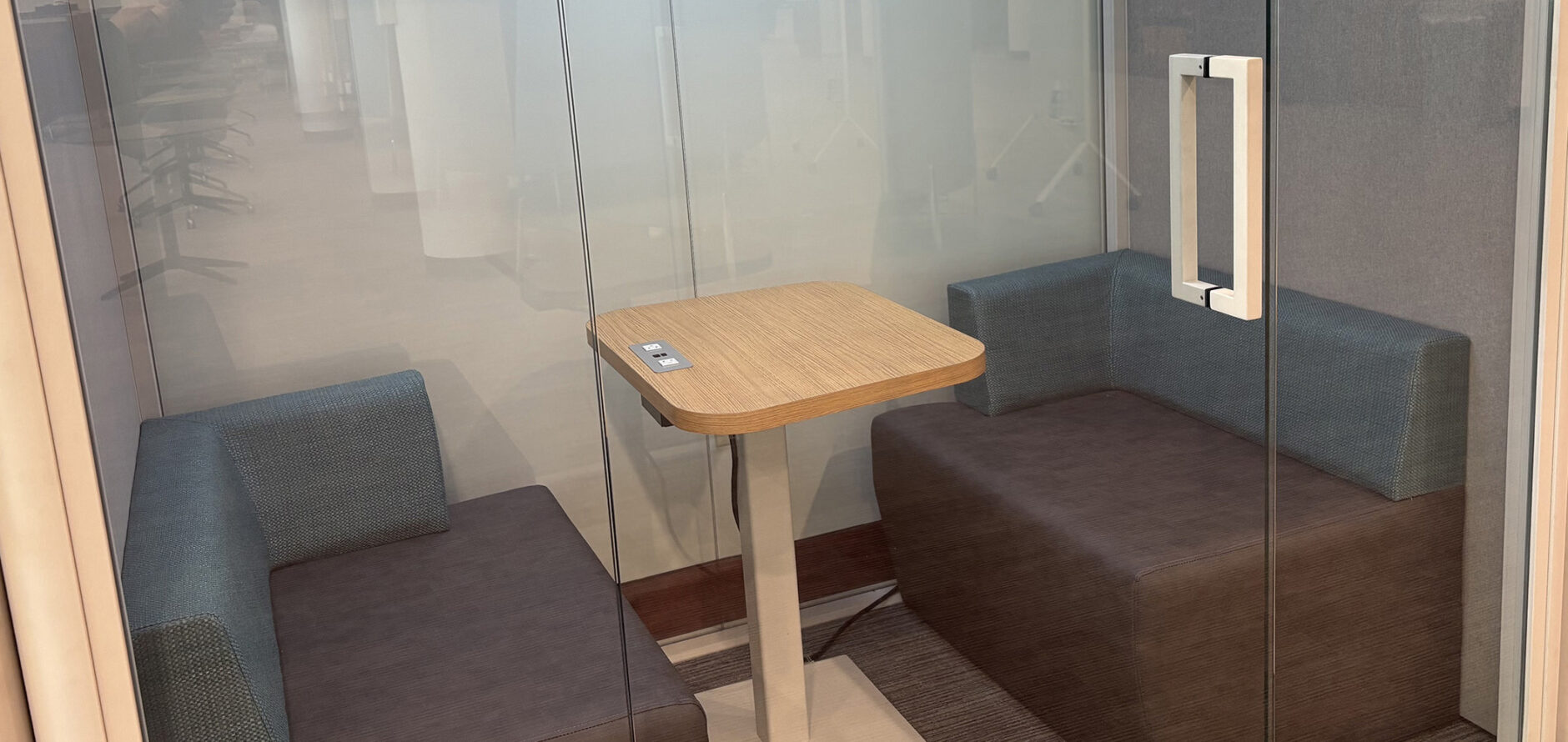 The standing booth is for individuals to engage in shorter phone calls, virtual meetings, or study activities. When empty, it is available for walk-in use.