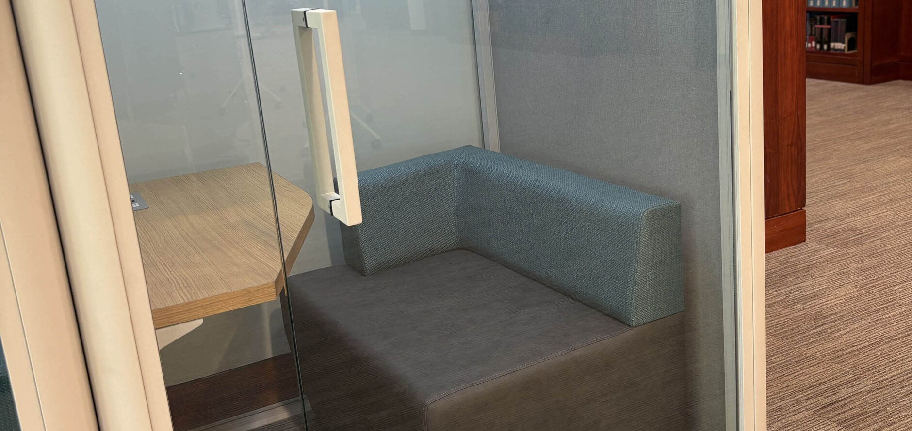 This studio booth is reservable for individuals to engage in phone calls, virtual meetings, or study activities. When empty, it is available for walk-in use.