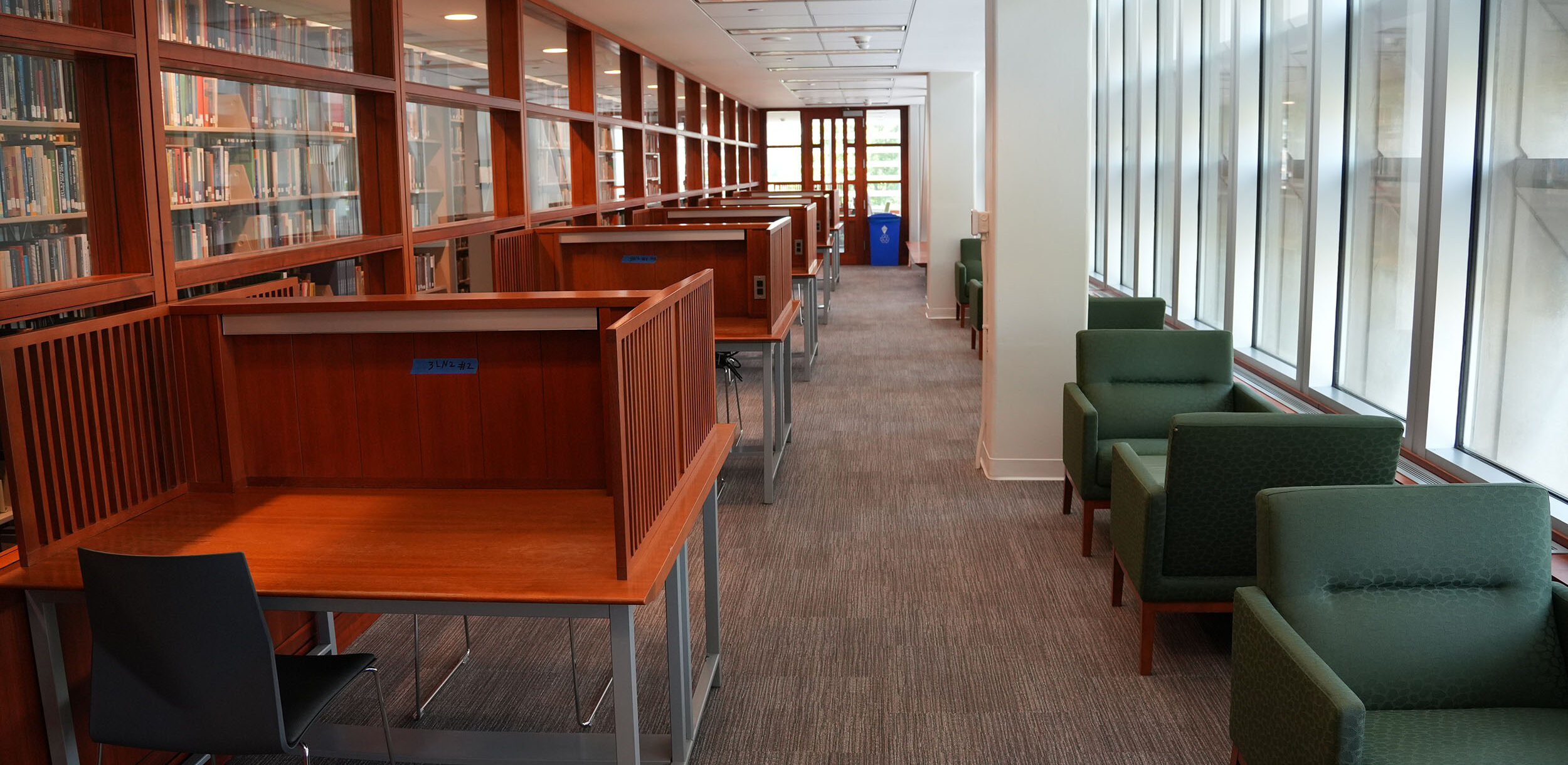 This room has study carrels and armchairs available on a first-come, first-served basis and is accessible to graduate students with a valid WashU ID.
