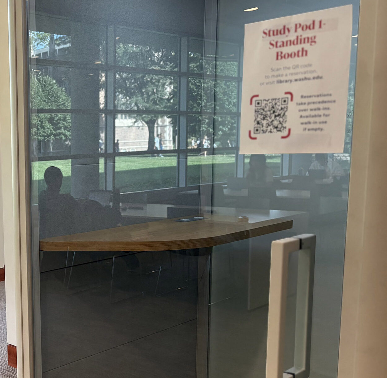 The standing booth is for individuals to engage in shorter phone calls, virtual meetings, or study activities. When empty, it is available for walk-in use.